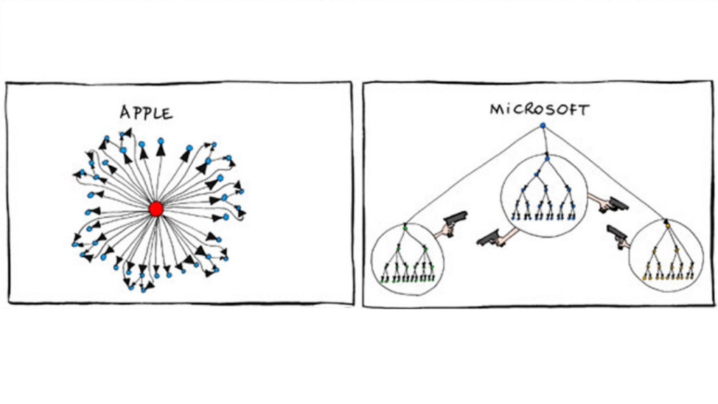 This old joke org chart comparison illustrates a few truisms – at Google, Larry & Sergei might have had the ideas, but Eric Schmidt ran everything. Oracle perhaps spent more on enforcing licensing than on engineering, and at Apple (post 1996), everything revolved around Steve and all decisions went back to him.
