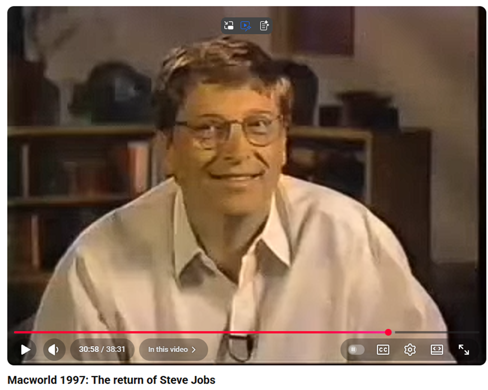 Jobs made a hugely important point to the Macworld congregation at the time: they need to let go of the idea that for Apple to win, Microsoft has to lose. This idea that competitors can sometimes work together for mutual benefit or even survival is clearly valid.