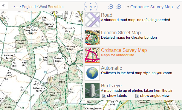 Bing Maps showing Ordnance Survey, with other options including licensed London A-Z Maps