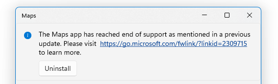 Microsoft also had a Maps app for Windows, which was a wrapper for the Bing Maps service but could also deal with offline data. Presumably due to lack of use, the Maps app has now been taken out behind the bike shed and given a good knobbling: