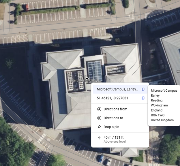 On the plus side, one useful feature which wasn’t present previously, the latest Bing Maps will show the exact address (including Post Code or Zip Code) of any point you right-click on, also displaying the lat/long coordinates and even the height above sea level.