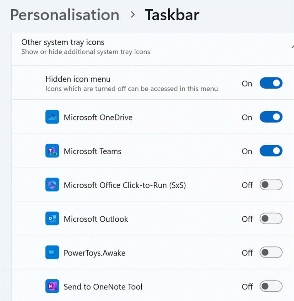 As you’d expect, Microsoft has defaulted only the more obviously-useful icons to be visible, like battery or Wi-Fi (for laptops), sound/volume etc. OneDrive is jammed in there too, if you have it set up to sync.